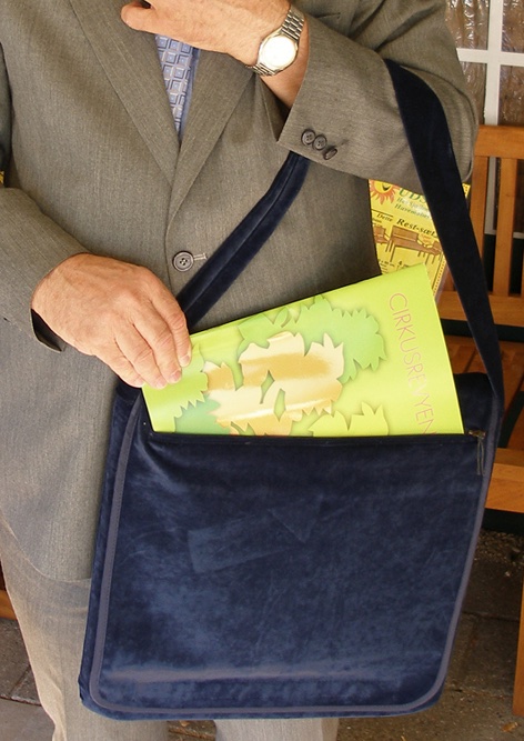 Taske lommen er 30 x 22 cm til program, bolcher og cikeretter, m.m.